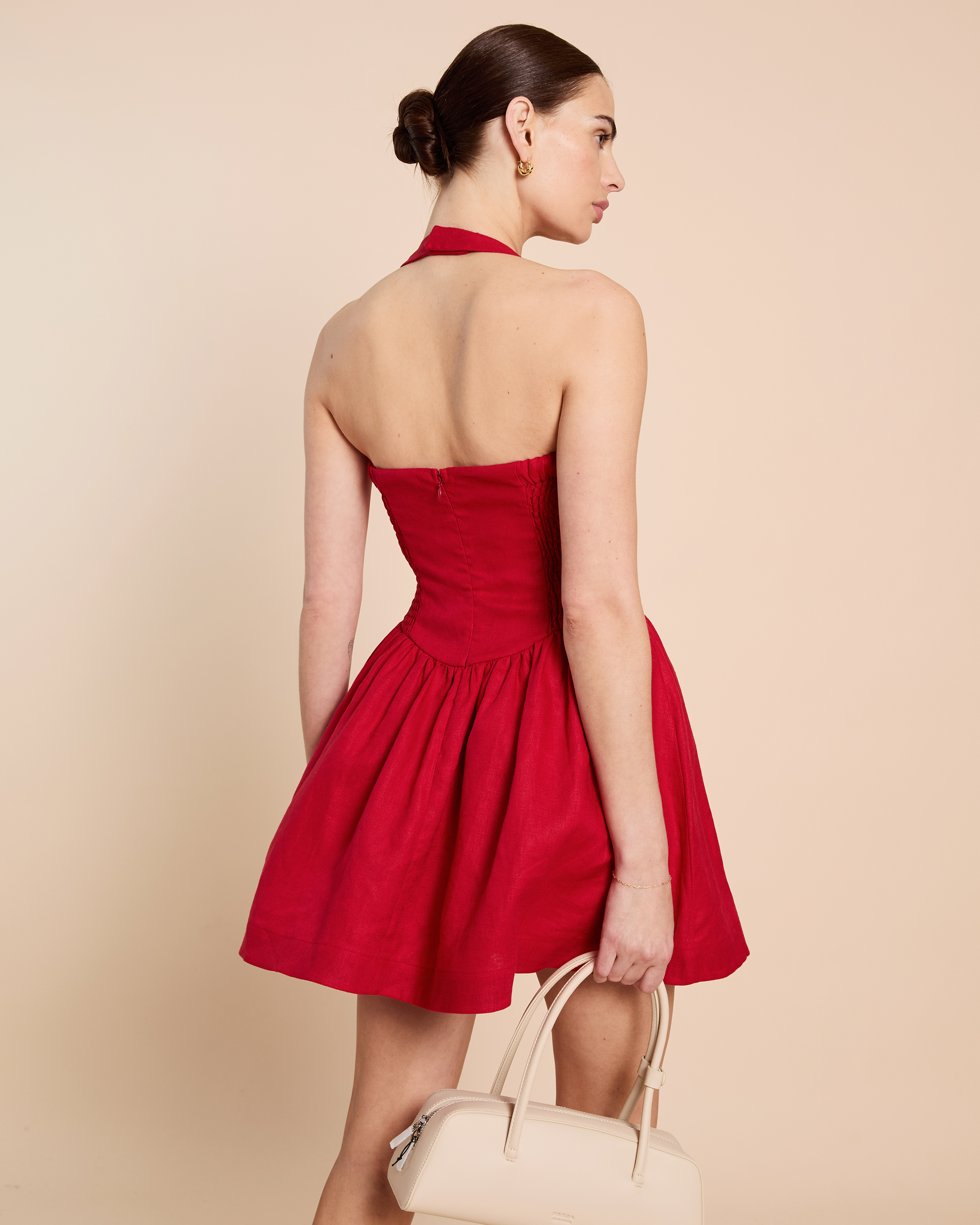This Piper Linen Mini Dress features a flattering halter neckline and classic front button detail. The adorable mini length creates an effortlessly charming silhouette, perfect for warm-weather occasions. Premium linen construction ensures comfort and breathability.