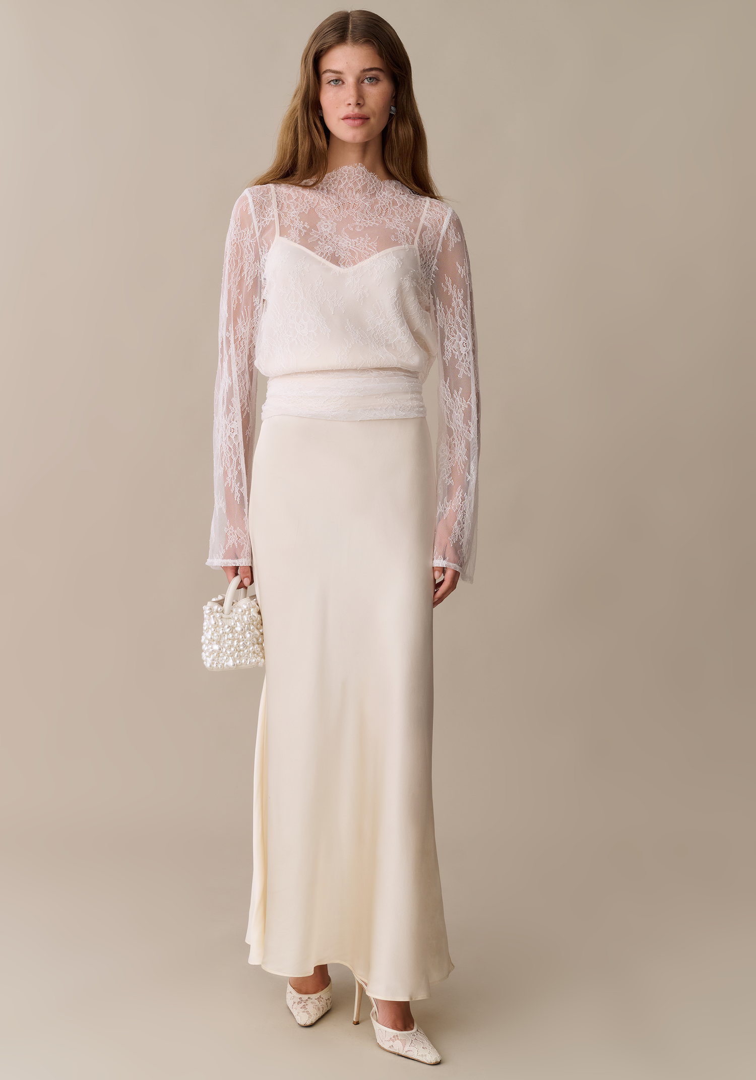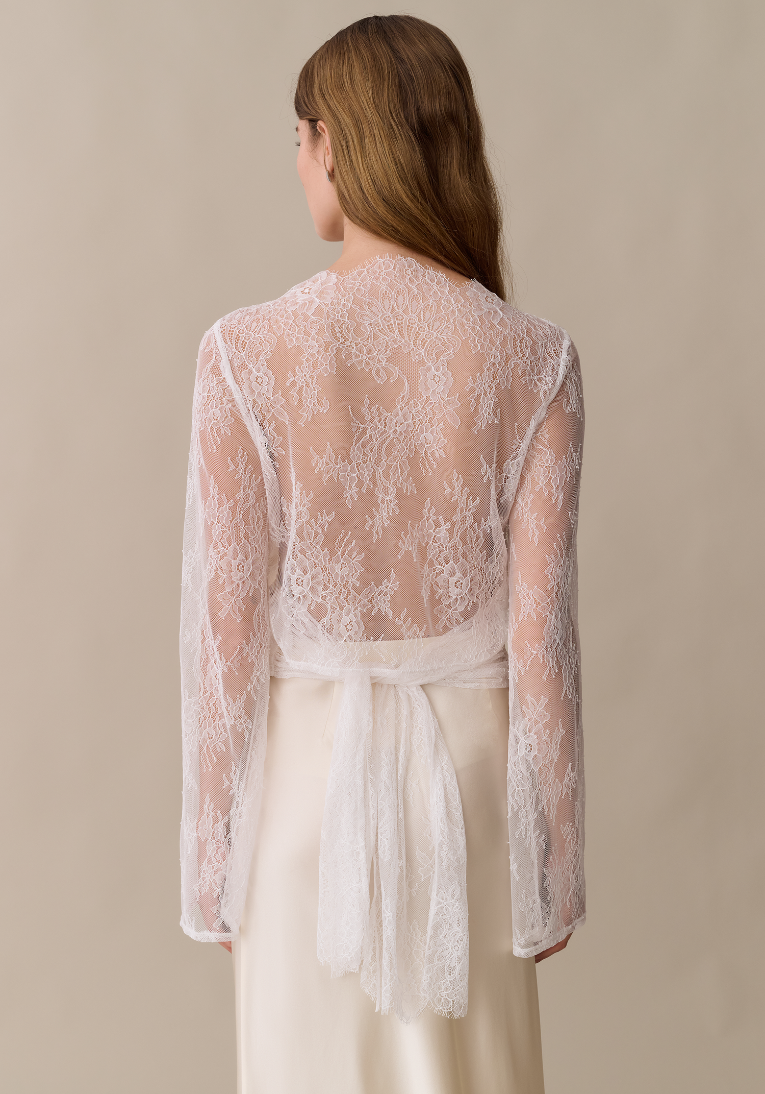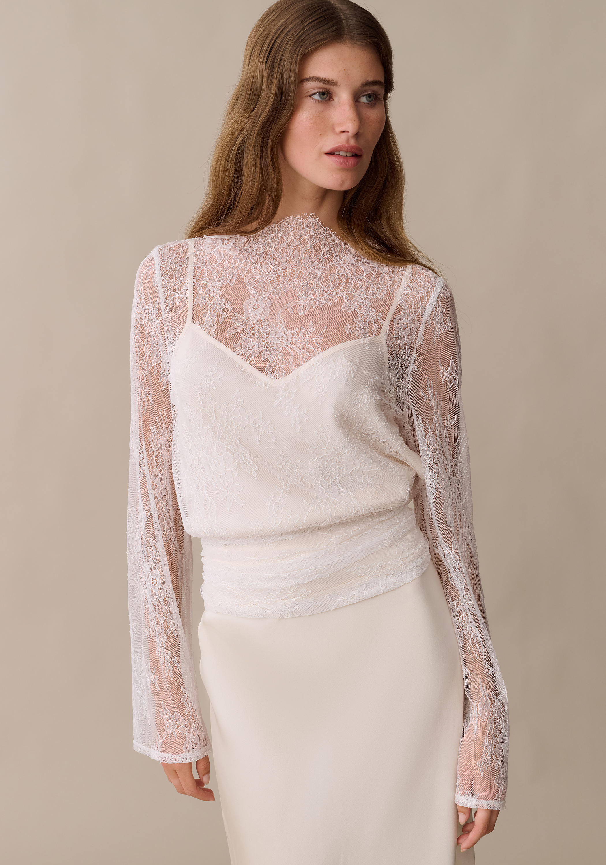 The Salome Top features stunning lace with a dramatic high neckline and built-in front lining for a polished fit. A ruched and fitted waist band is finished with a back tie for an adjustable fit. Delicate and romantic in design, this piece is perfect for those seeking something sophisticated yet impactful.
