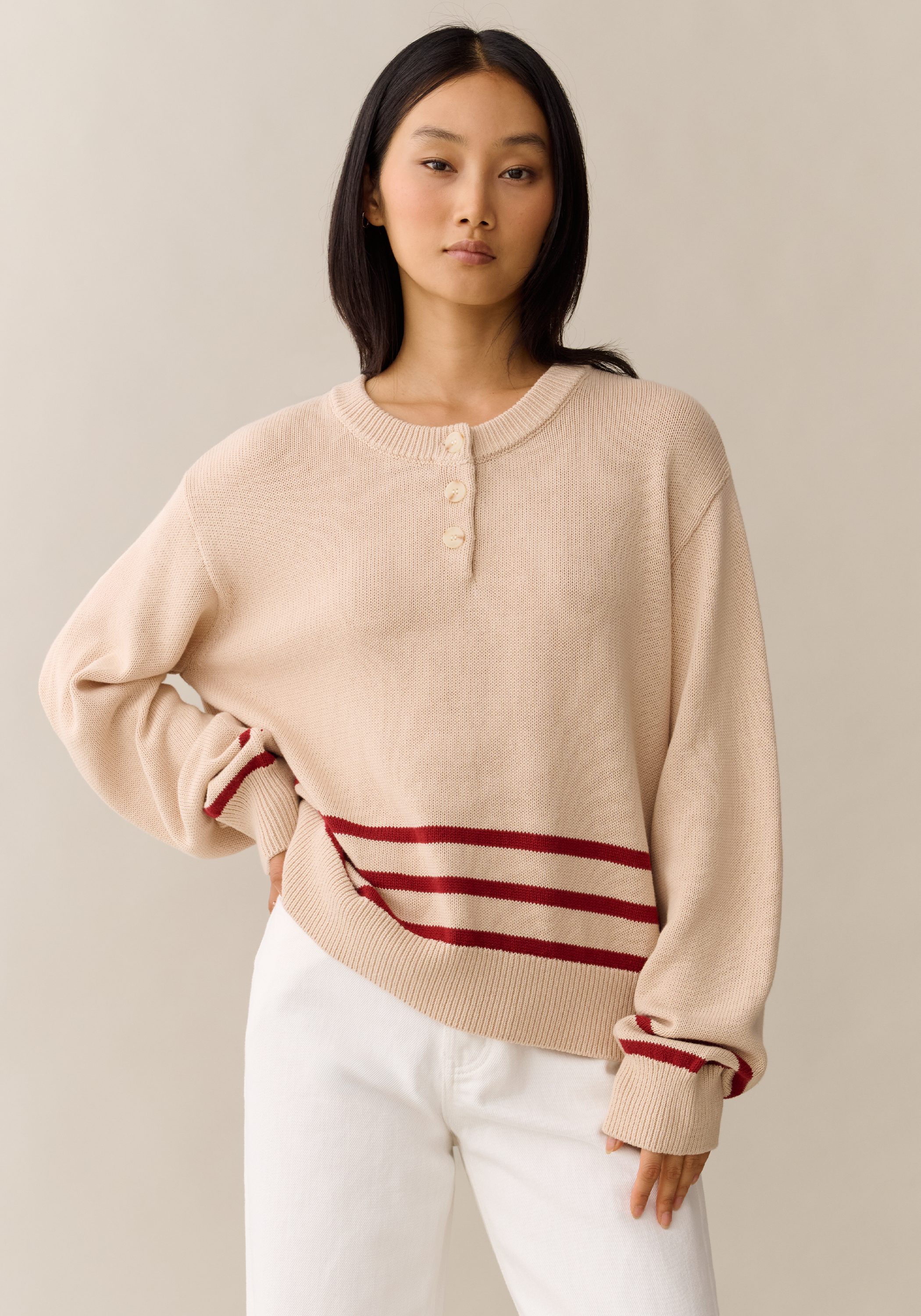 Crafted from 100% cotton, the Shoreline Cotton Sweater is a lightweight knit ideal for layering. Its breathable fabric ensures comfort, while the striped pattern adds to the timeless coastal aesthetic. Finished with front button details.