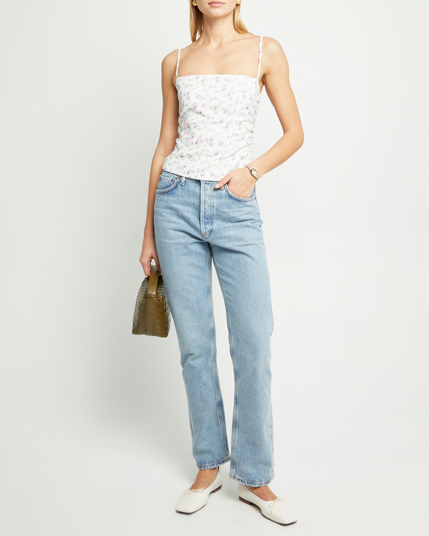 This easy camisole is done with a simple silhouette in a pretty floral print. Finished with delicate tie straps for a charming detail and back smocking for an easy fit.
