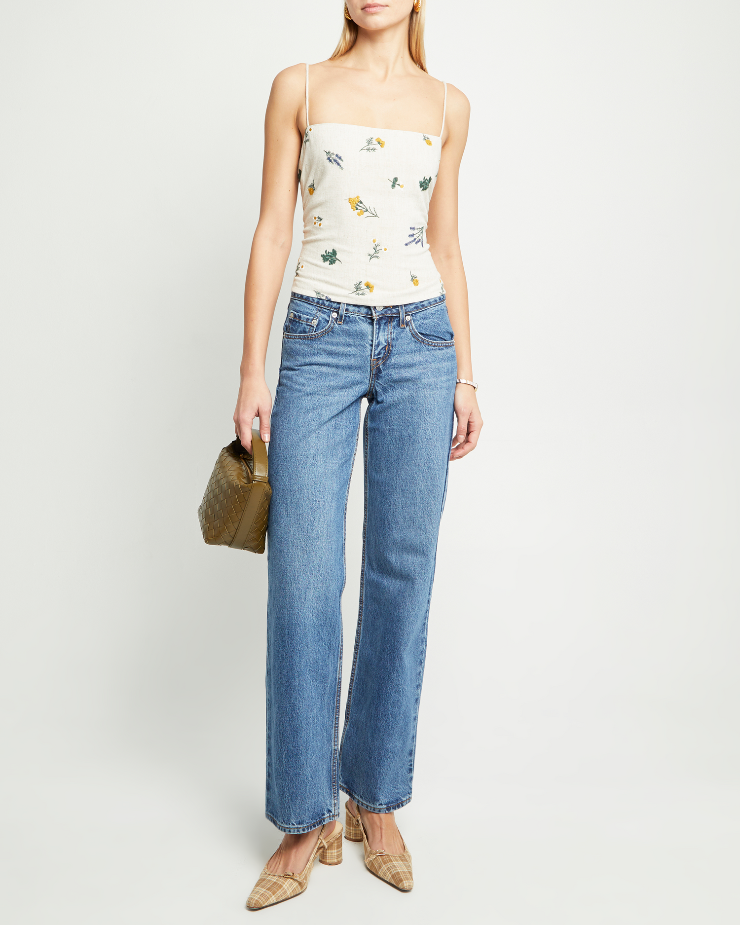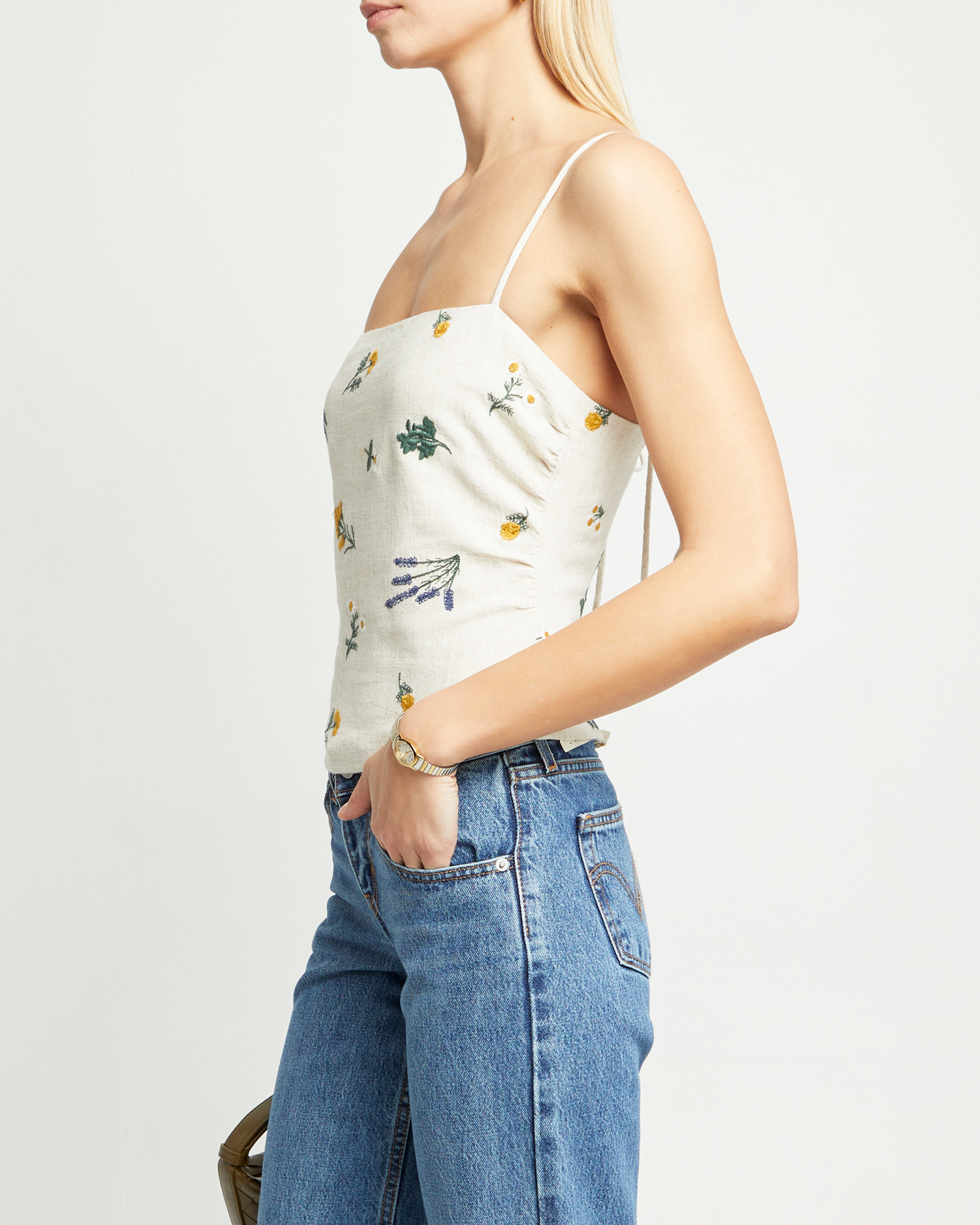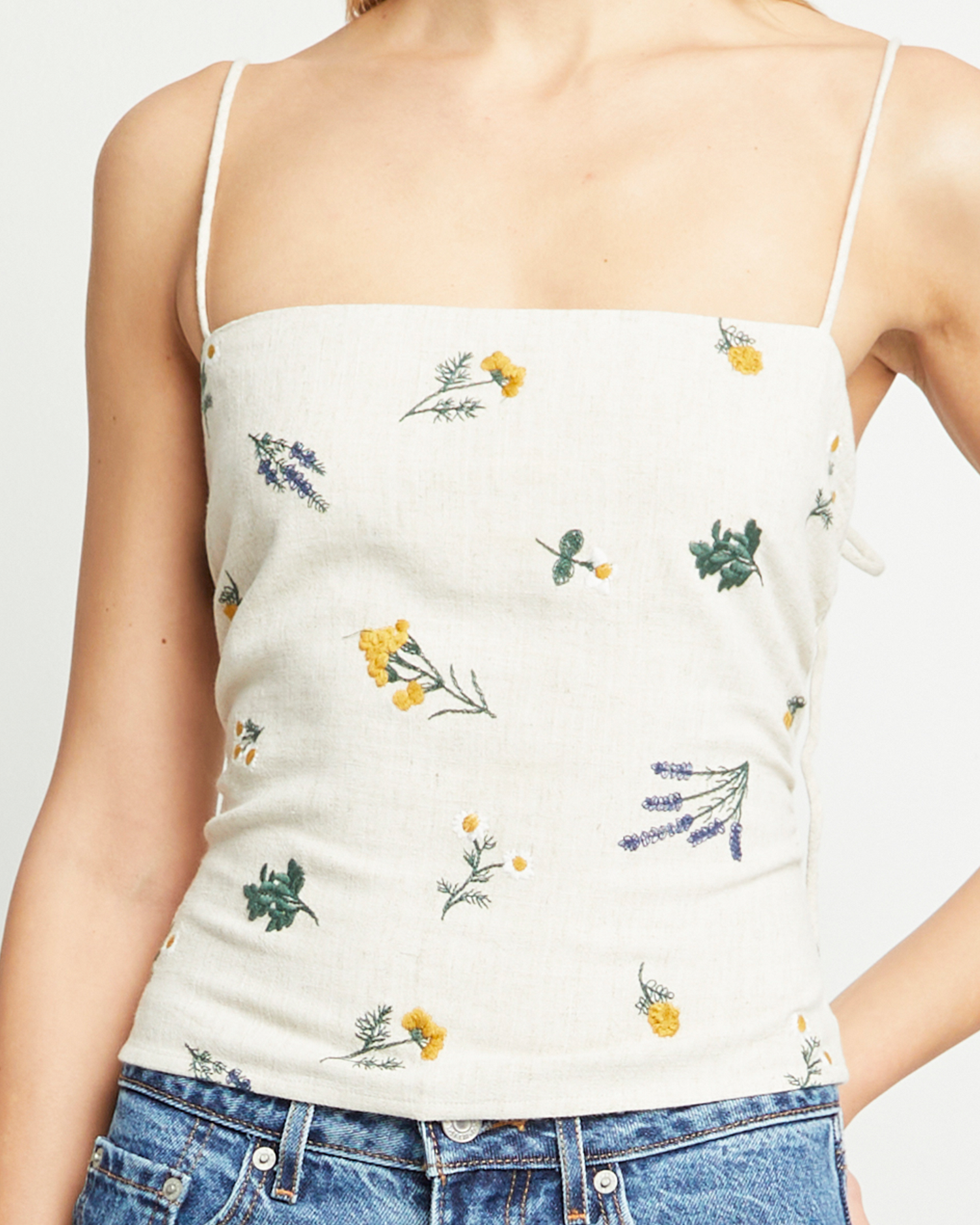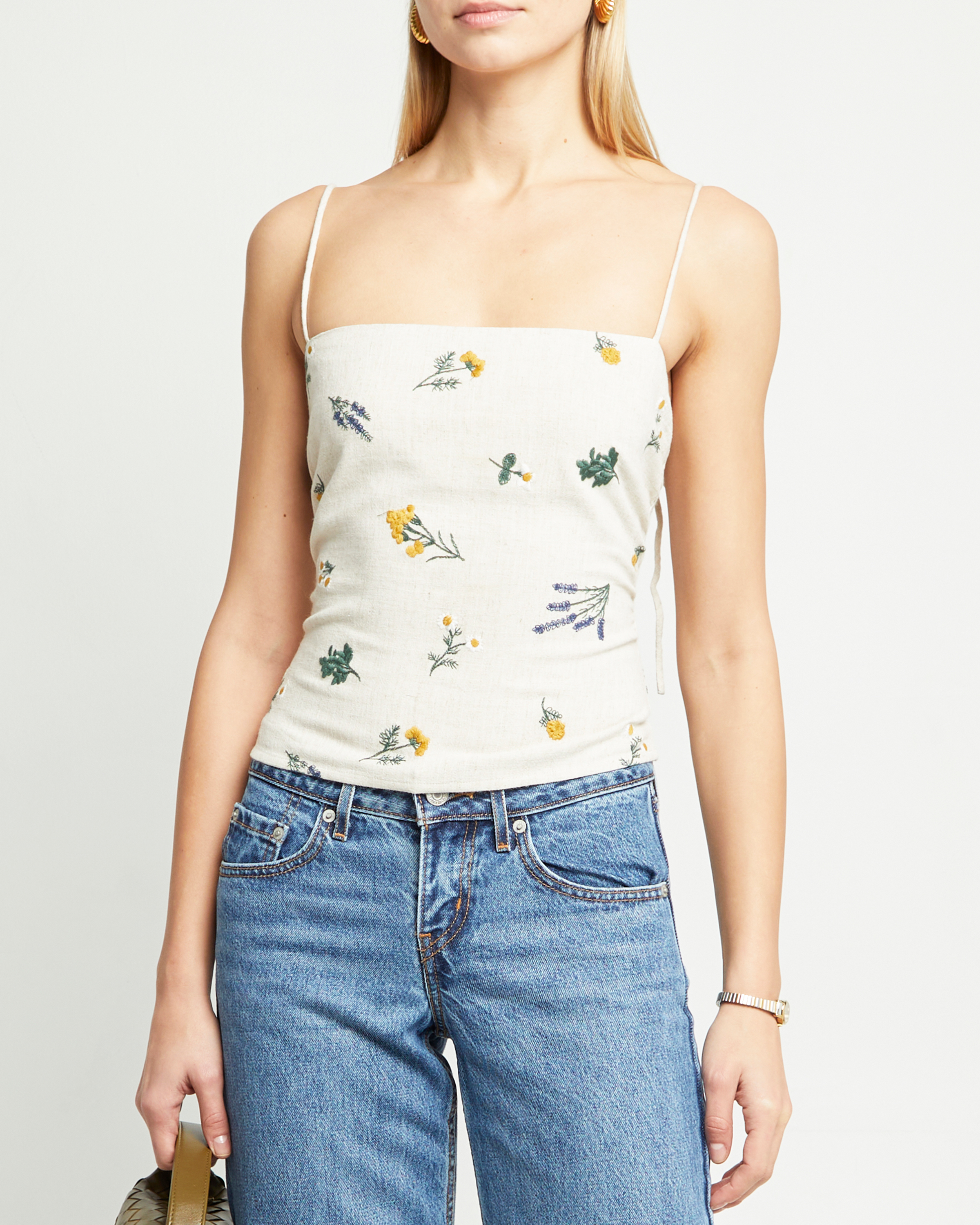 This easy camisole is done with a simple silhouette in a pretty floral print. Finished with delicate tie straps for a charming detail and back smocking for an easy fit.