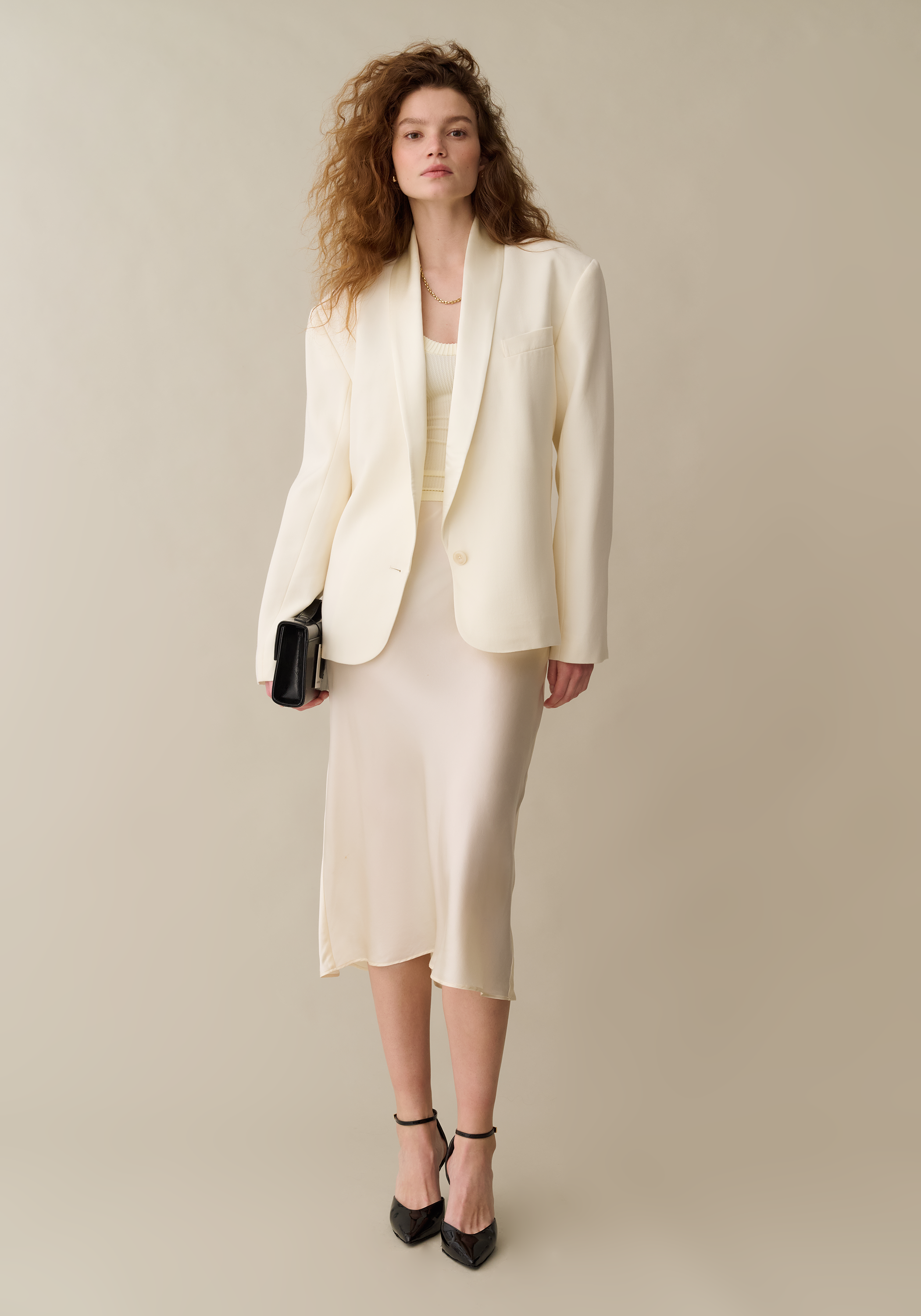 The Theda Blazer features an oversized, relaxed fit that creates an effortlessly chic silhouette. Crafted from wool, it offers warmth and durability, while the silk blend trim adds a refined touch of luxury. Its soft cream hue makes it a versatile addition to any wardrobe, perfect for elevating both casual and formal ensembles with understated elegance.