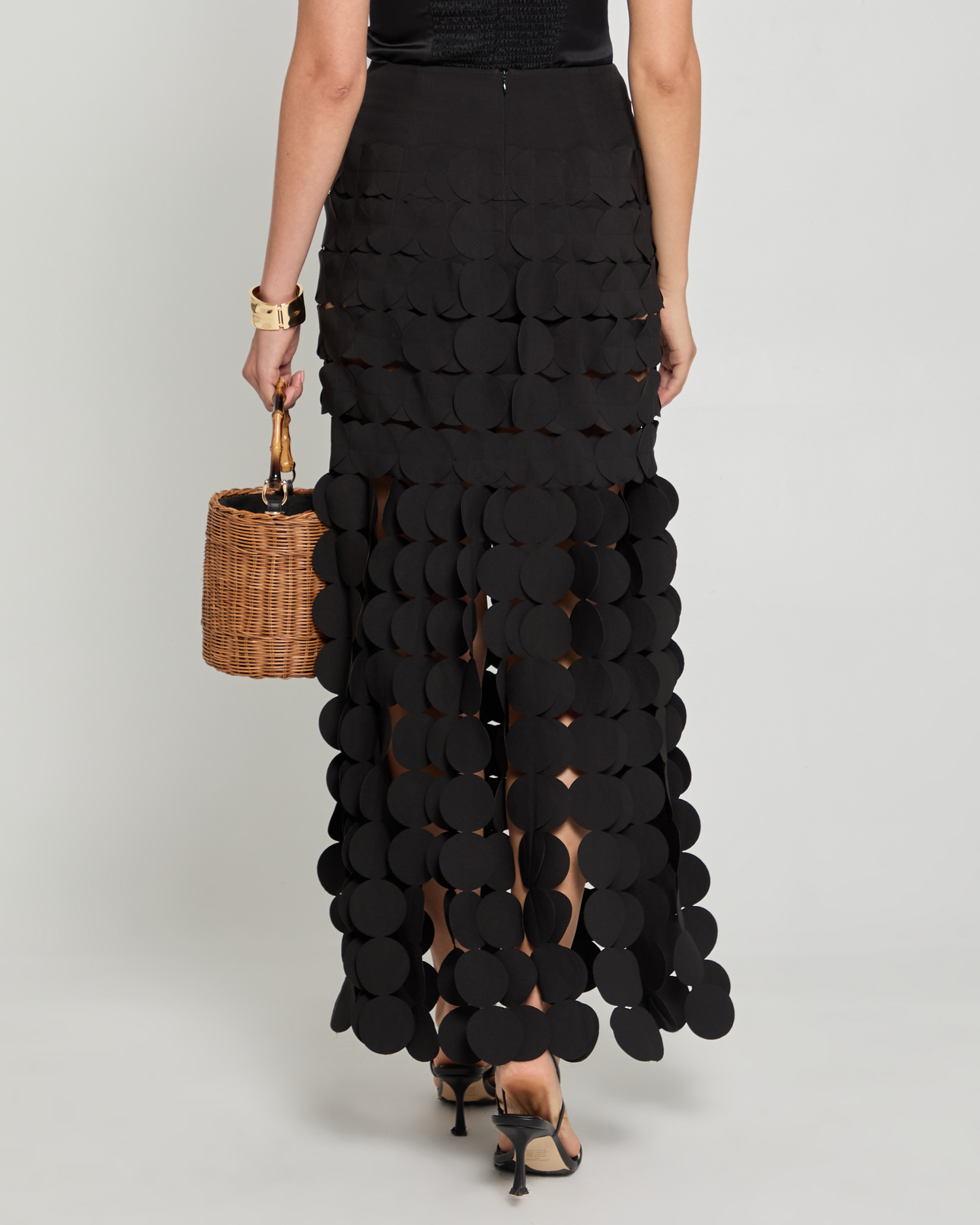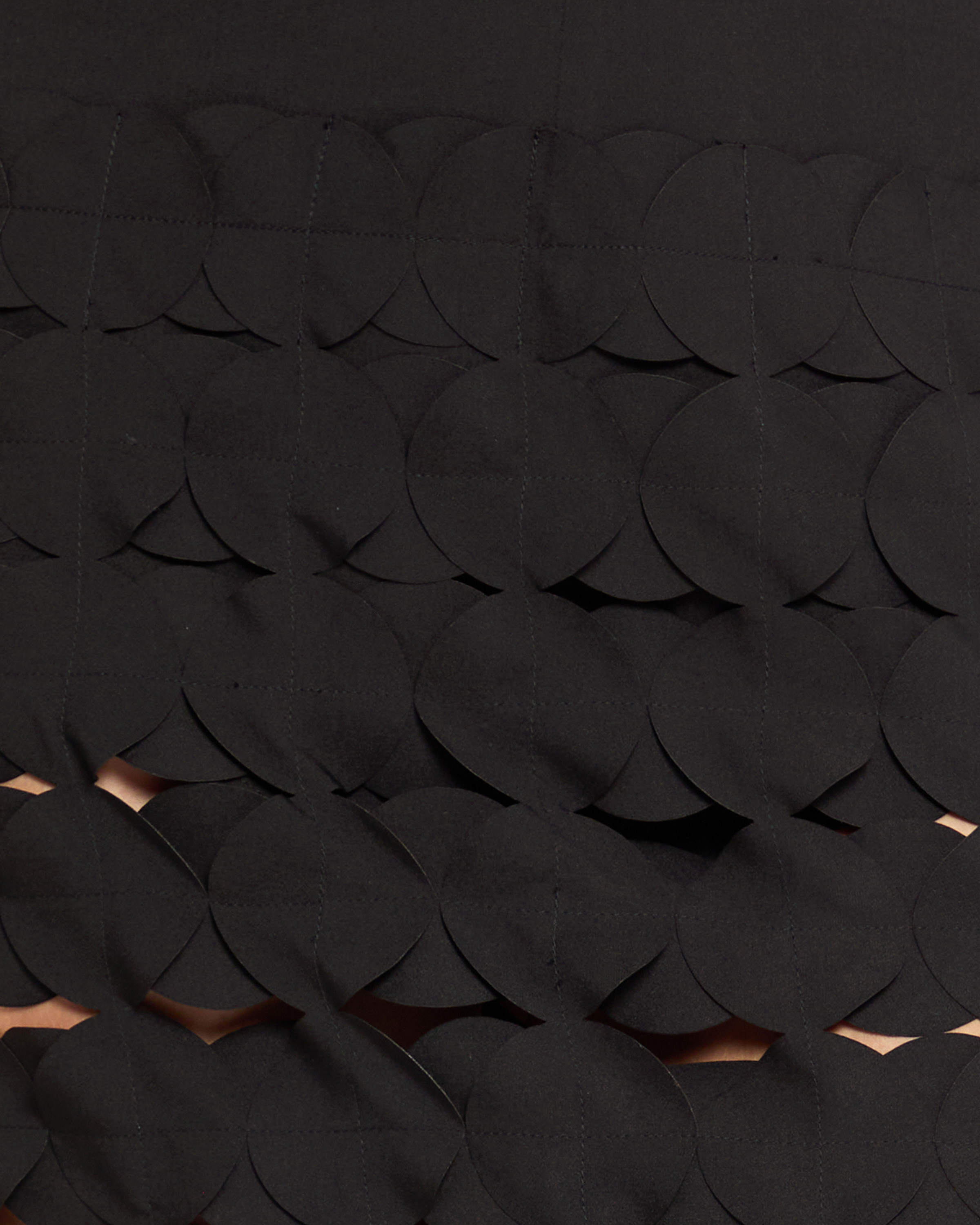 The Trista Skirt is a must-have for any fashion-forward individual. Boasting chic and unique design, this skirt features fun laser cut circular fringe that adds a playful touch to your style. Elevate your wardrobe with this statement piece.