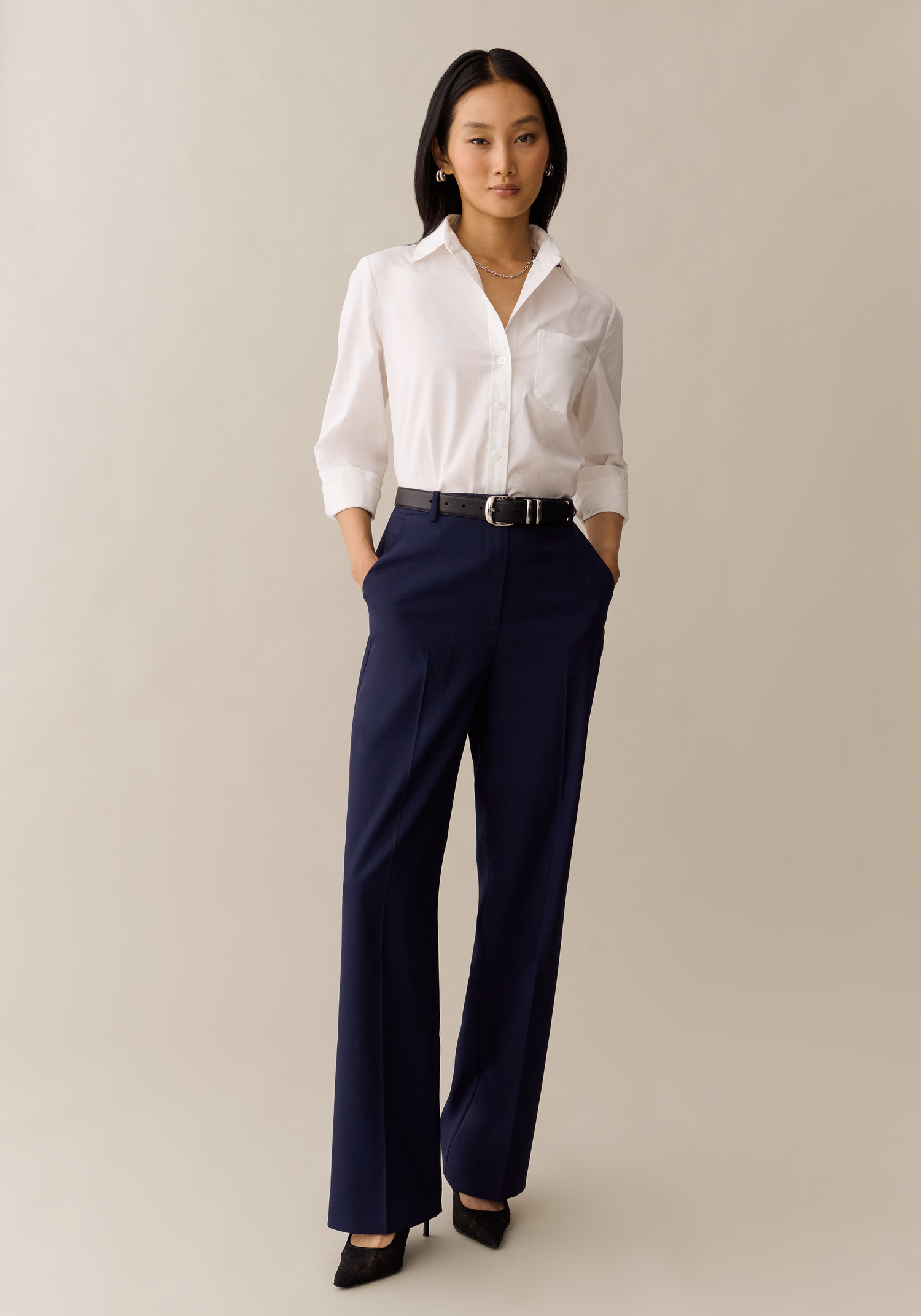 Shirt is the perfect shape and fit. The quality is just ok. It doesn't stay crisp. Although I kept it, I wouldn't pay $49 for it again, as it is more like a $29 blouse. Two buttons fell off during the first wearing.